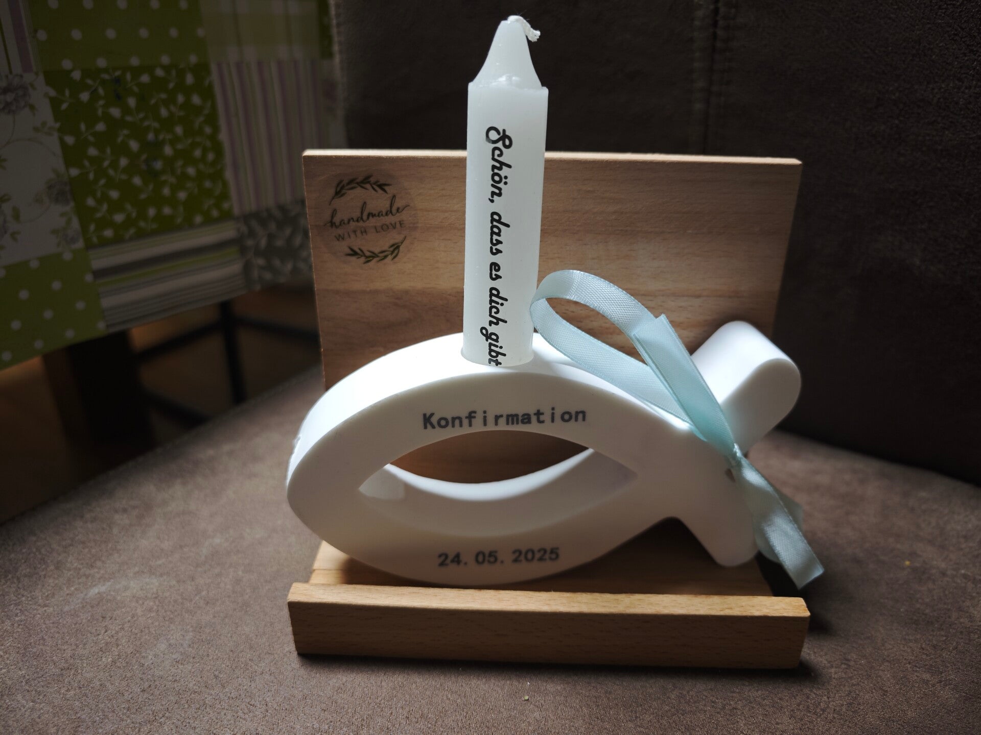 Gips Keramik Fisch mit Datum und Text/Name, Kerze und Holzaufsteller. Abmessungen ca. 16*16cm
