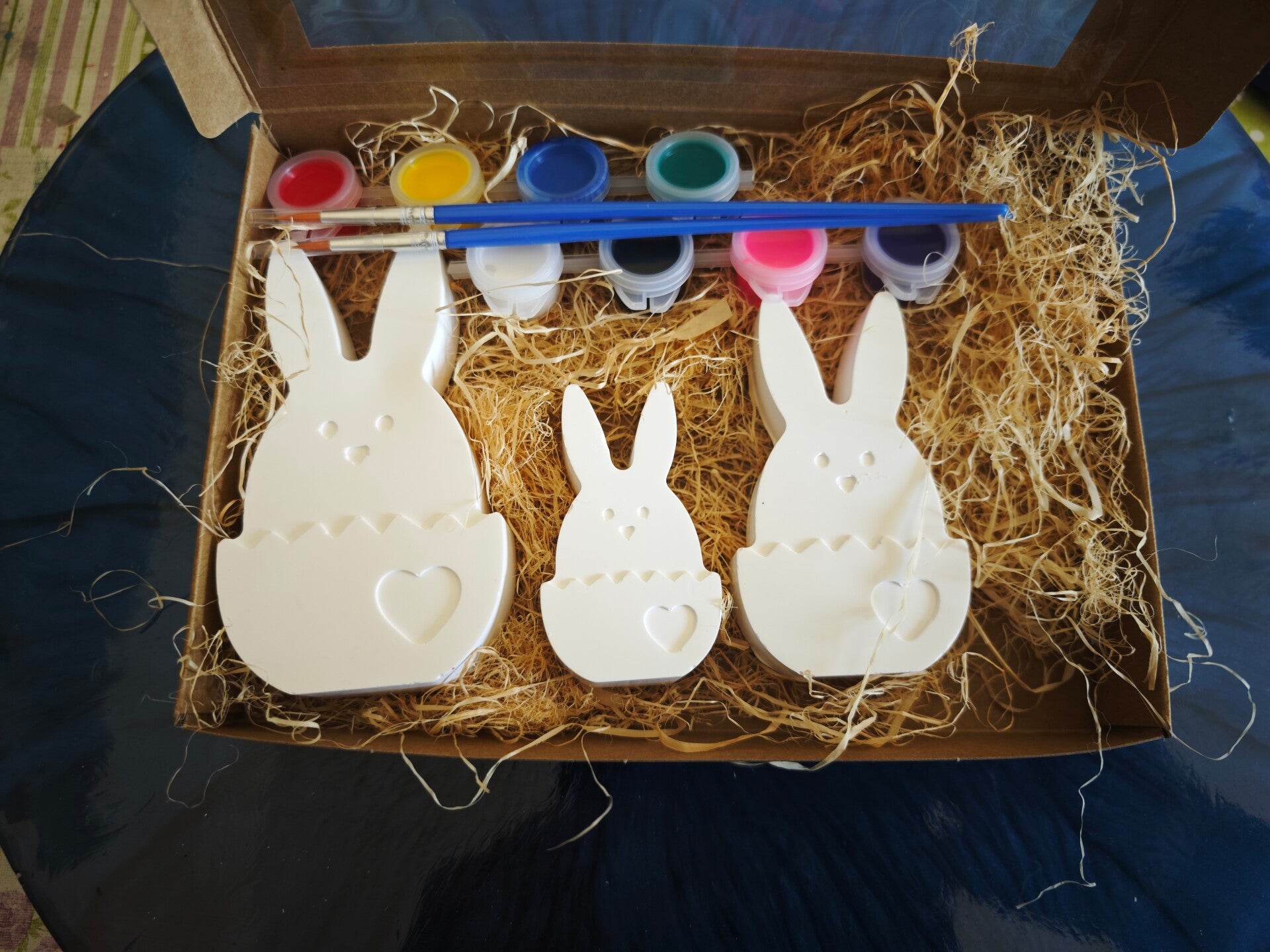 Im Set 1 enthalten 3 Hasen Höhe 10/8/6 cm breite 6/5/4 cm stärke 1,9 cm Holzwolle 8 Acrylfarben und 2 Pinsel