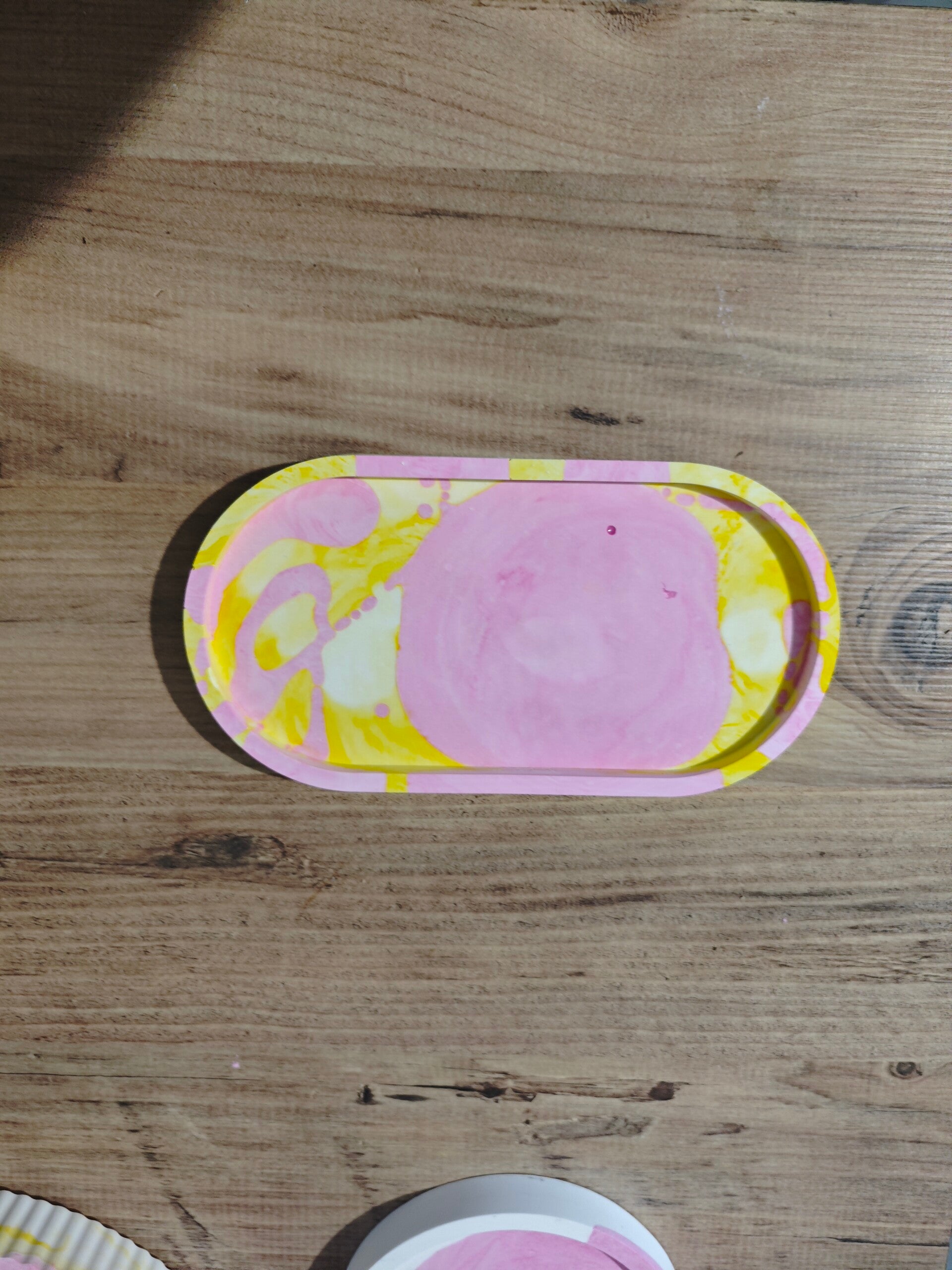 Tablett aus Keramik Gips mit Farbmuster Gelb Pink Weiß Länge 16 cm Breite 15 cm Unikat