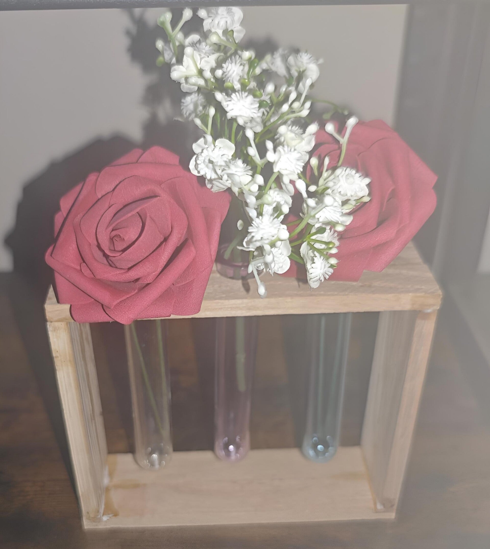 Holzständer mit drei Reagenzgläser für Blumen