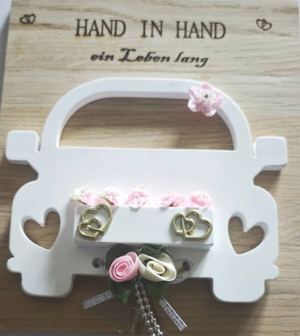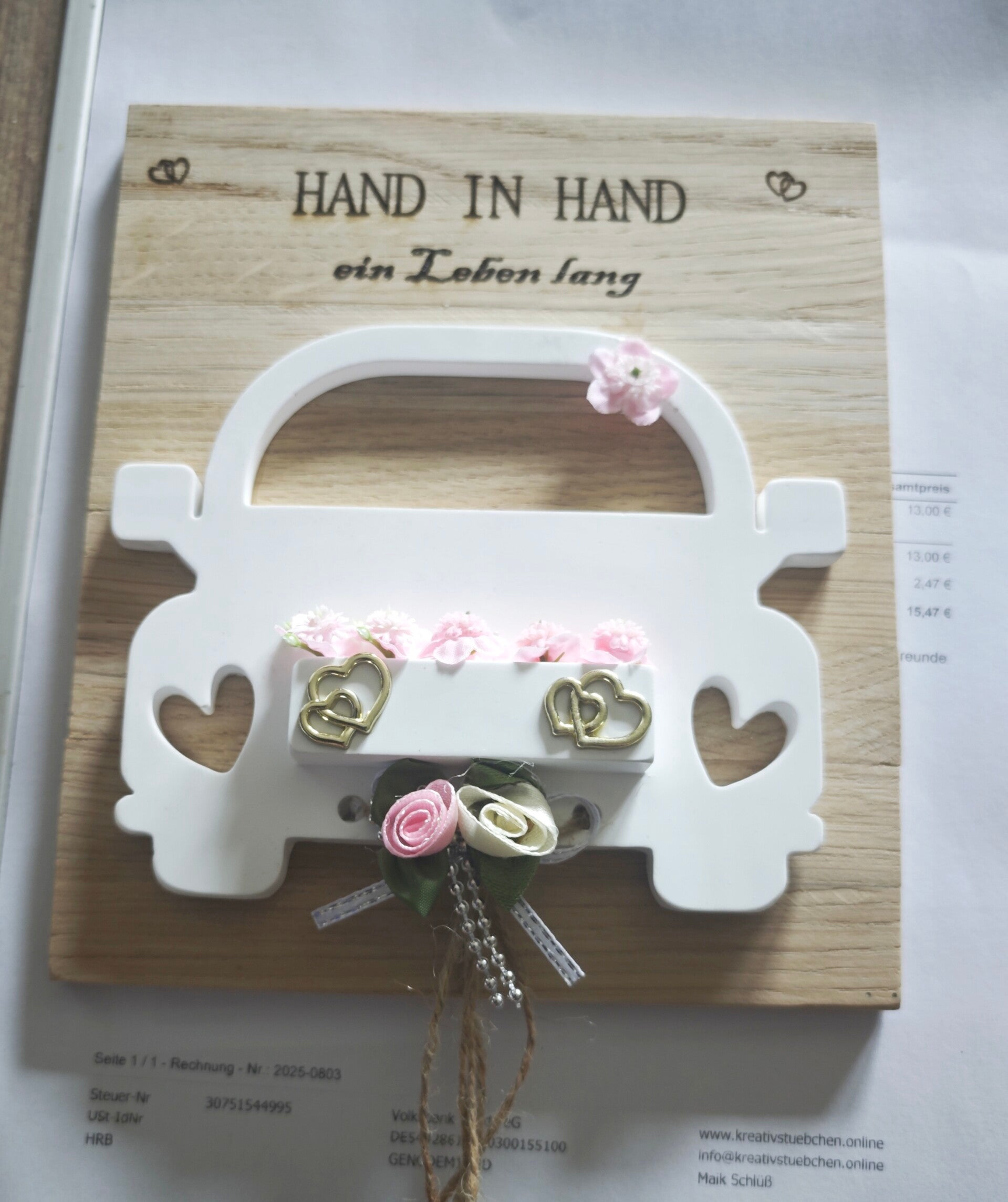 Dieses liebevoll gestaltete Holz-Deko-Element ist das perfekte Geschenk zur Hochzeit. Auf einer Holzplatte (Maße ca. 14 x 18 cm) ist ein stilvolles Hochzeitsauto-Motiv aus Holz angebracht, geschmückt mit zarten Blumen-Details und kleinen goldfarbenen Eheringen. Unten befindet sich eine dekorative Kordel, an der Geldröllchen oder kleine Botschaften befestigt werden können – ideal für ein originelles Geldgeschenk.