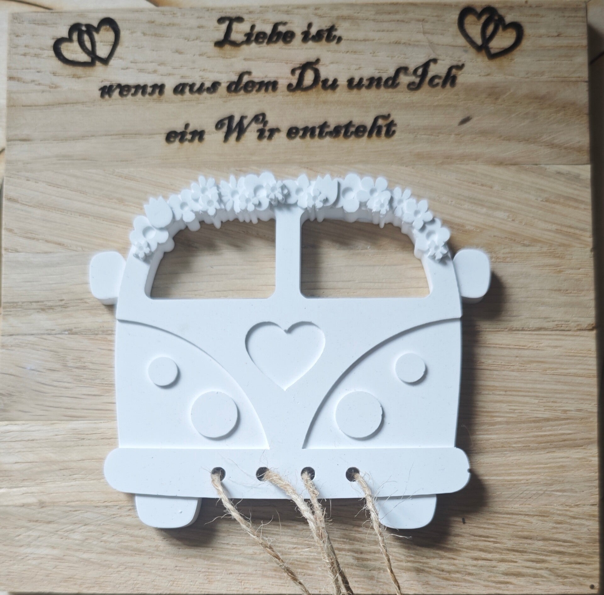 Der eingravierte Spruch auf dem Holz ist individuell gestaltbar, sodass du eine ganz persönliche Botschaft für das Brautpaar hinzufügen kannst. Neben dem klassischen Hochzeitsauto ist auch eine Variante mit VW-Bus-Motiv erhältlich.