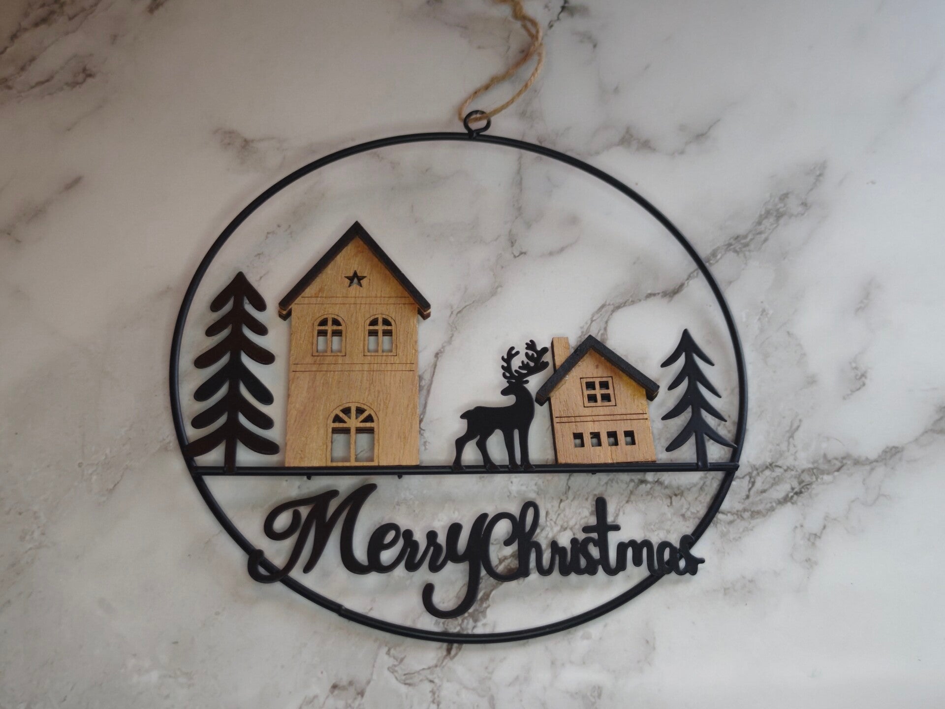 Deko Ring Weihnachtsmotiv Metall Schwarz und Holzhäuser d=20 cm mit Kordel zum Aufhängen