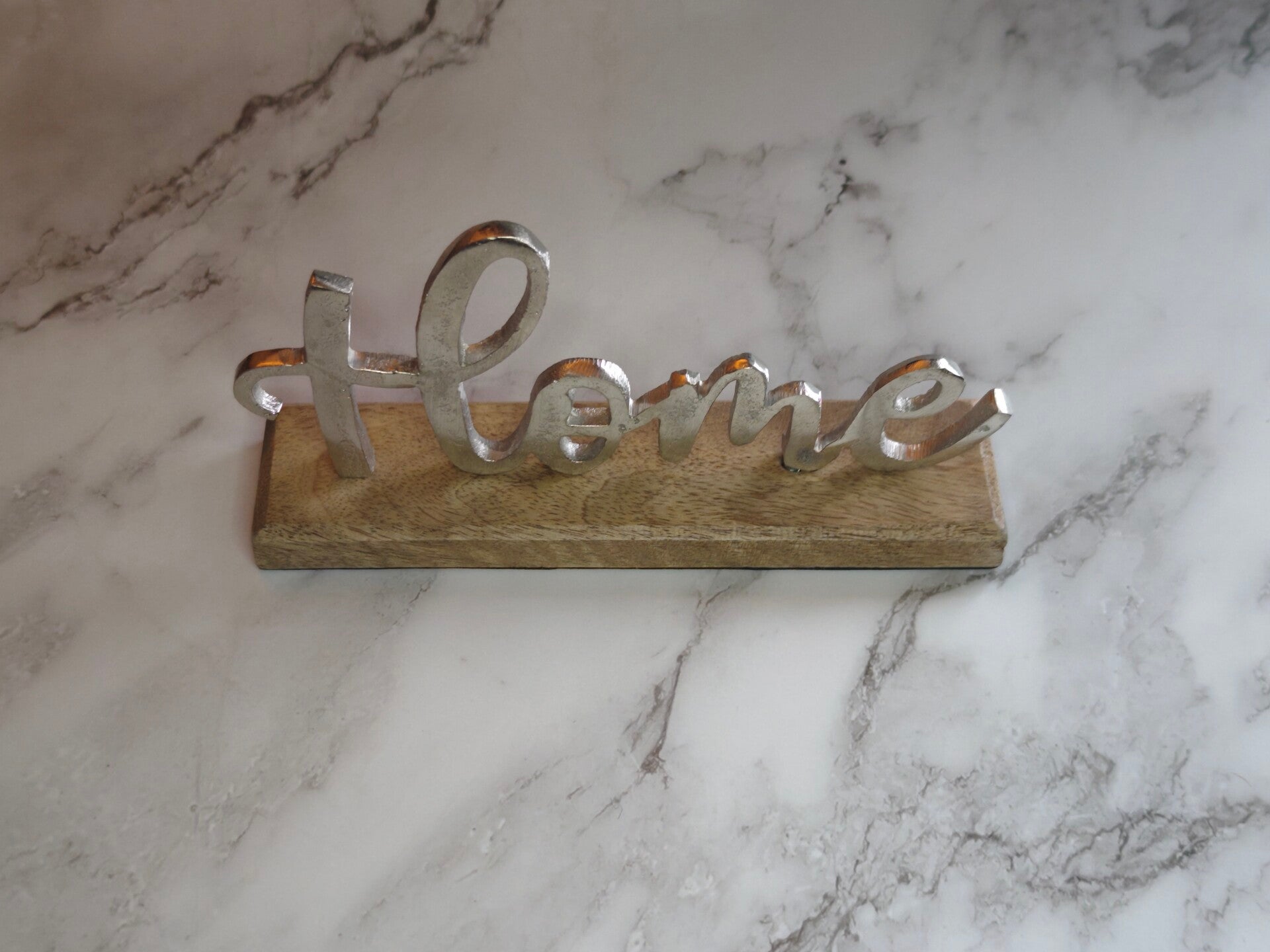 Aufsteller aus Holz und Schriftzug aus Metallguss l*b*h 14 Natur Farben und Silberfarbig mit Filzgleiter
