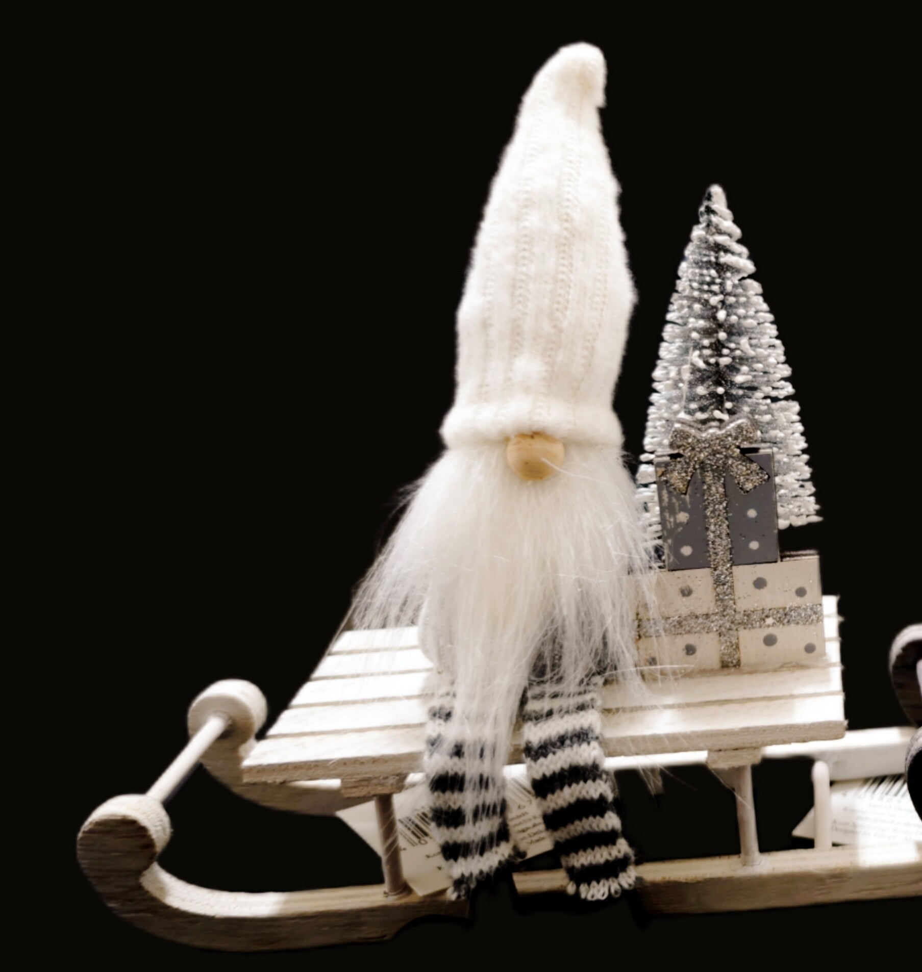 Winterliche Wichtel auf Holzschlitten – liebevolle Weihnachtsdekoration