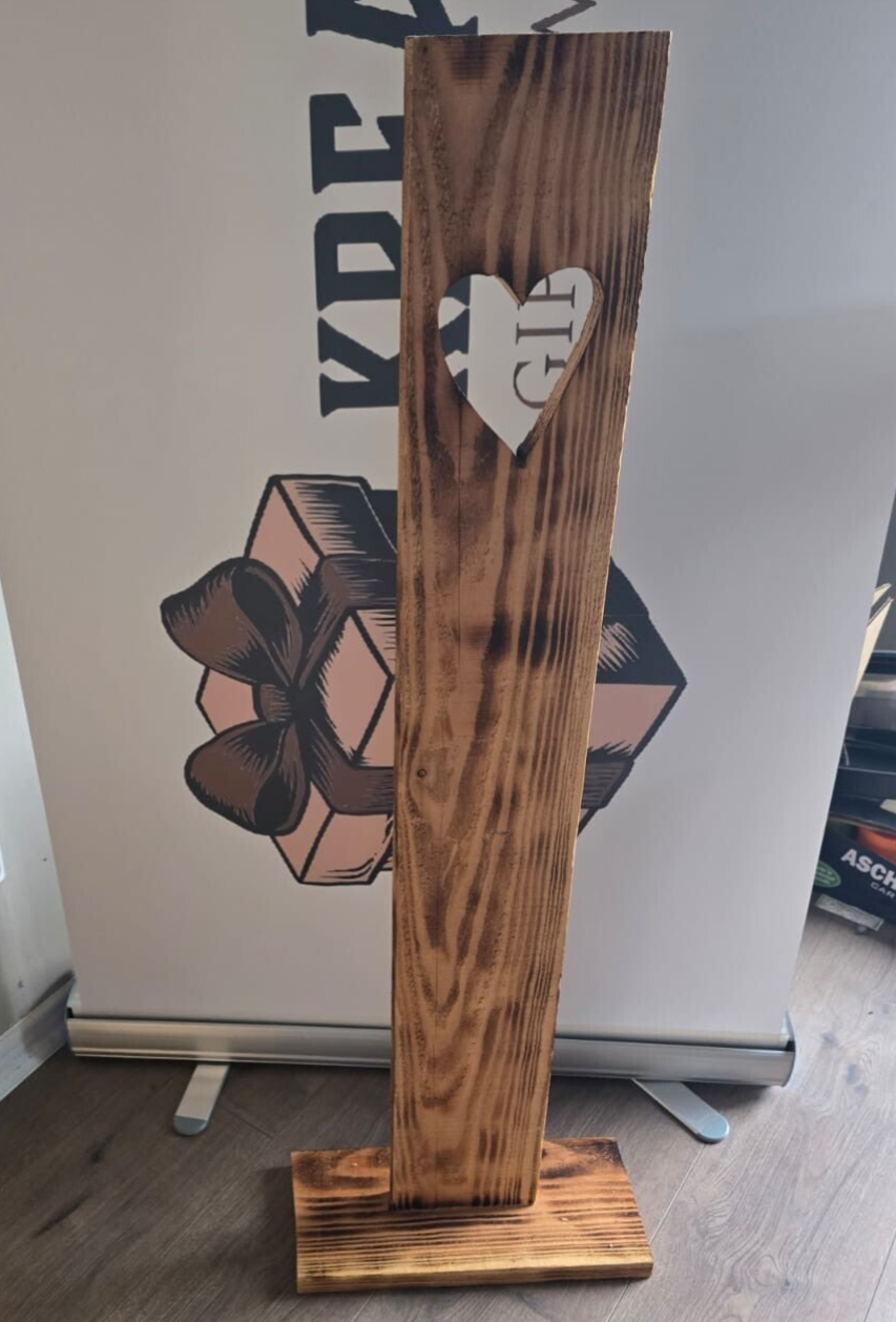 Verschieden Holzsteelen aus Fichtenholz geflammt mit Text und Laterne zum Stellen.